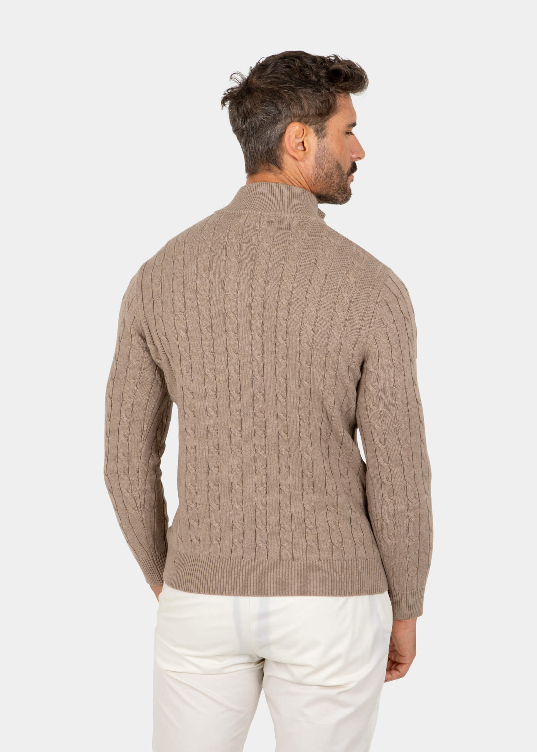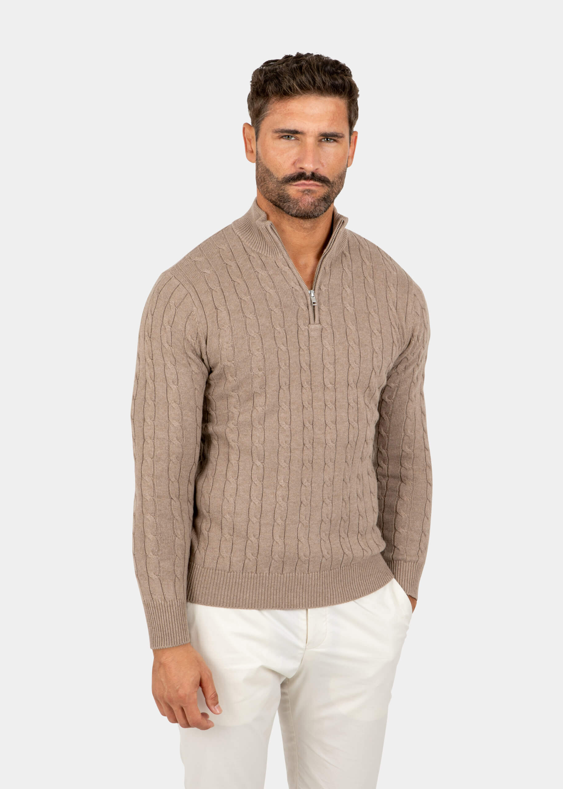 Knitted in a classic cable pattern from soft, breathable cotton, this ¼ zip sweater delivers texture, structure, and versatility. The midweight construction offers year-round comfort — warm enough for cool days yet light enough for layering under outerwear.