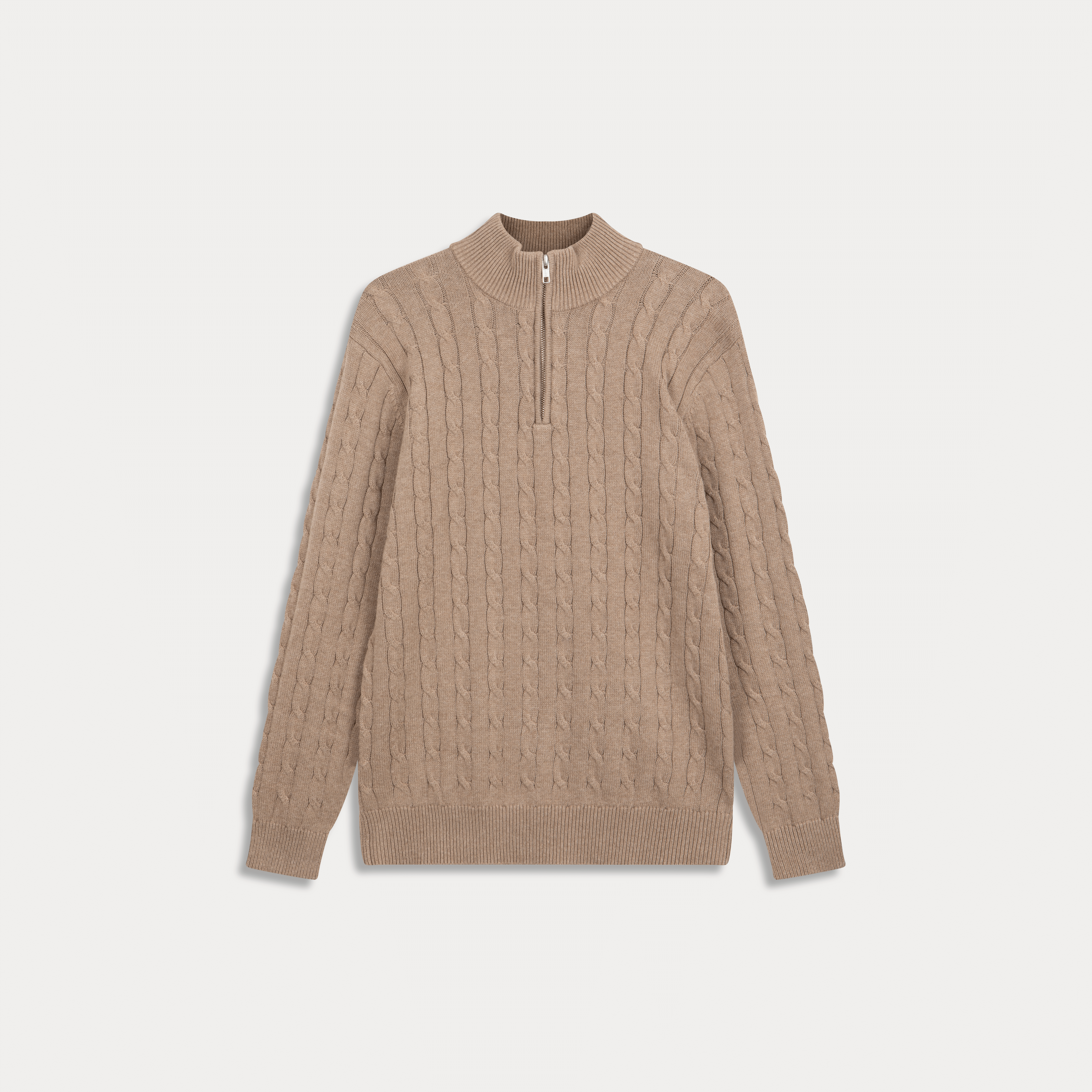 A sleek mock neck and metal zipper lend a contemporary touch, while the ribbed cuffs and hem maintain a clean, tailored silhouette. The fine cable knit adds subtle depth and visual interest, elevating this essential into a refined, transitional piece for any wardrobe.